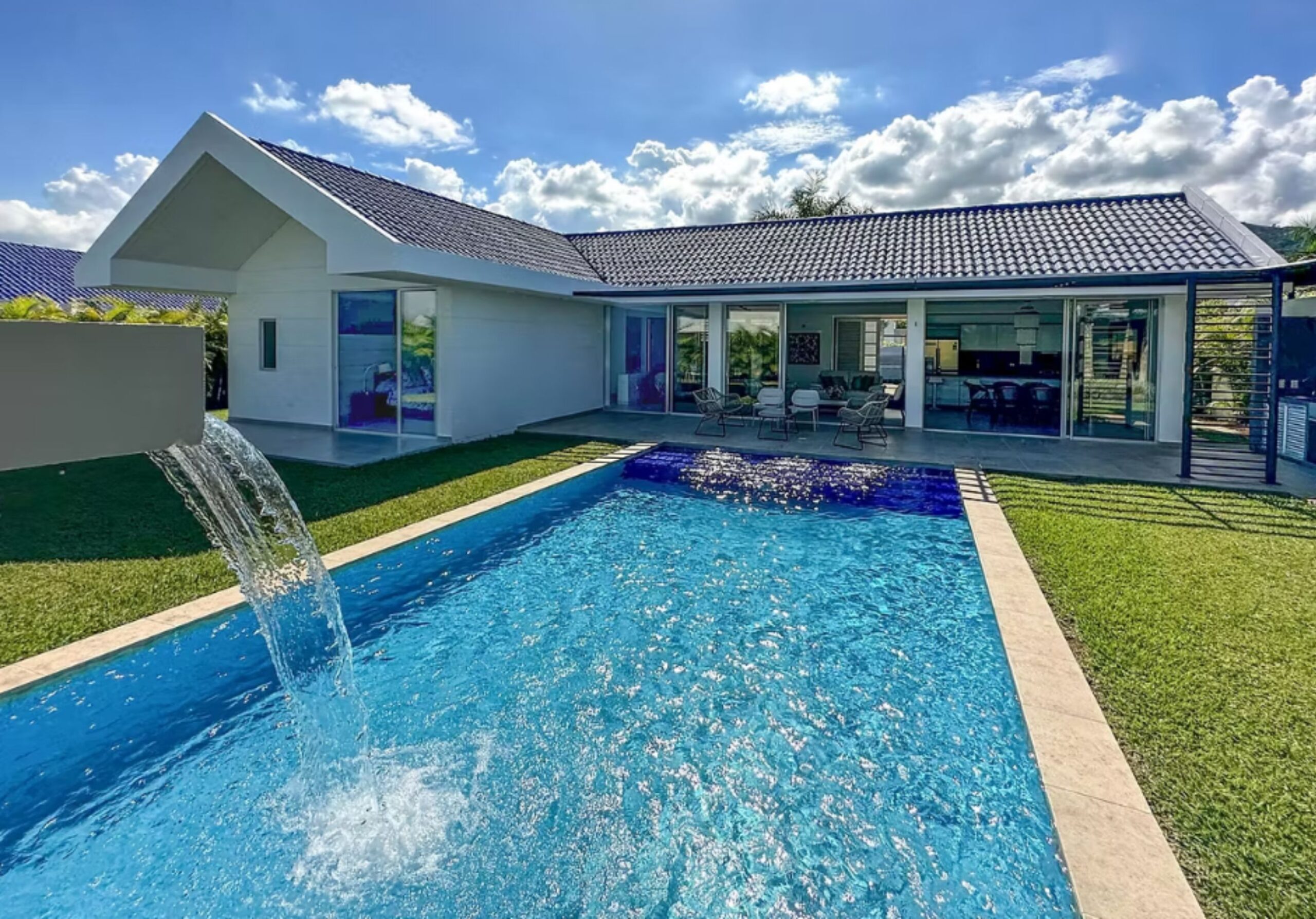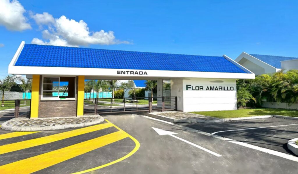 Flor Amarillo, el más nuevo y completo, ofrece 134 casas de un solo nivel, con un área construida de 220 m² y lotes de hasta 859 m². Cada vivienda cuenta con cuatro habitaciones con baño privado, piscina con cascada, zona de BBQ, baños auxiliar y social junto a la piscina, y depósito. Las entregas están programadas para agosto de 2024.